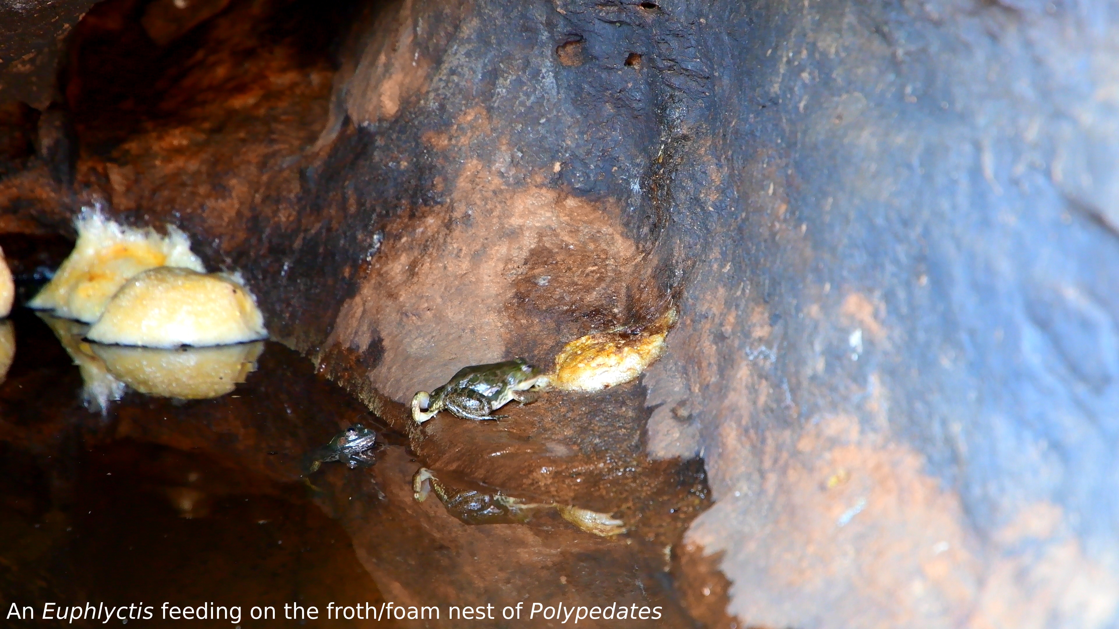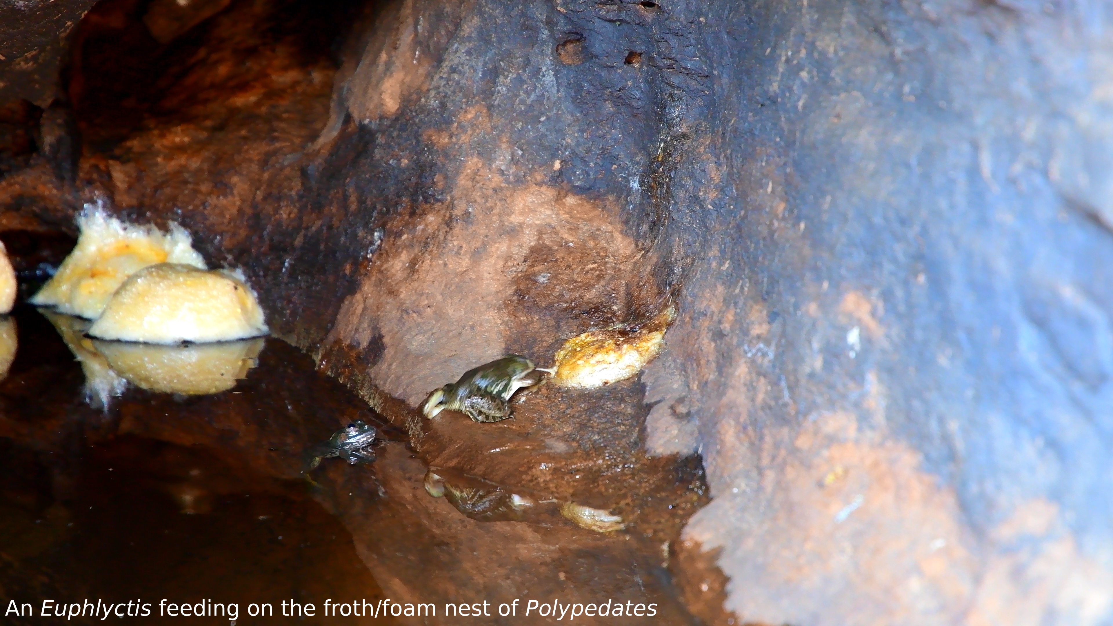 On the 14th of March, 2020, our team went out for a casual field trip to the nearby hills of Barunei, Jatni, just next to our institute. Little did we know we would encounter a novel behavioral phenomenon in anurans. In a temporary pool of water inside a rocky cave, on top of the stunted Barunei hill, we observed three species of anurans living together. We found one species, i.e., Polypedates (Rhacophoridae), breeding in the pool of water. This species lay their eggs in the form of froth/foam nests deposited in water. To our surprise, we observed one of the other con-generics, i.e., Euphlyctis (Dicroglossidae), predating upon these froth/foam nests. It was one of the most curious and exciting behavior we had observed in anurans to date.
